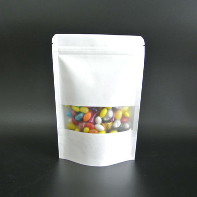 Kantong Kertas Kraft Stand Up Putih Disesuaikan dengan Jendela Matte Clear dengan Ritsleting untuk Permen, Makanan ringan, Kemasan Makanan